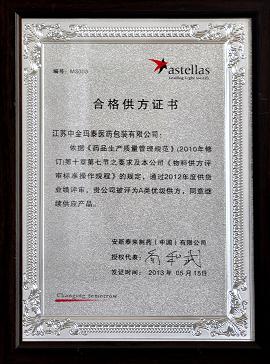 7月,安斯泰來制藥(中國)有限公司供應商大會在沈陽召開,會上,中金瑪泰被安斯泰來制藥評為2012年度A類優級供方。這一獎項的獲得也代表了用戶對中金瑪泰產品及服務的高度認可。作為醫藥包裝行業的領軍企業,中金瑪泰始終視產品質量為企業的生命線,在立足于高品質,高起點的基礎上,憑借具有國際先進水平的生產設備及工藝,通過建立完善有效的質量管理體系,以及配備先進、精密的檢驗、檢測設備,以科學的生產管理高標準、嚴要求對產品生產的各個環節進行全過程的質量控制及檢驗,確保為客戶提供安全、安心的醫藥包裝產品。