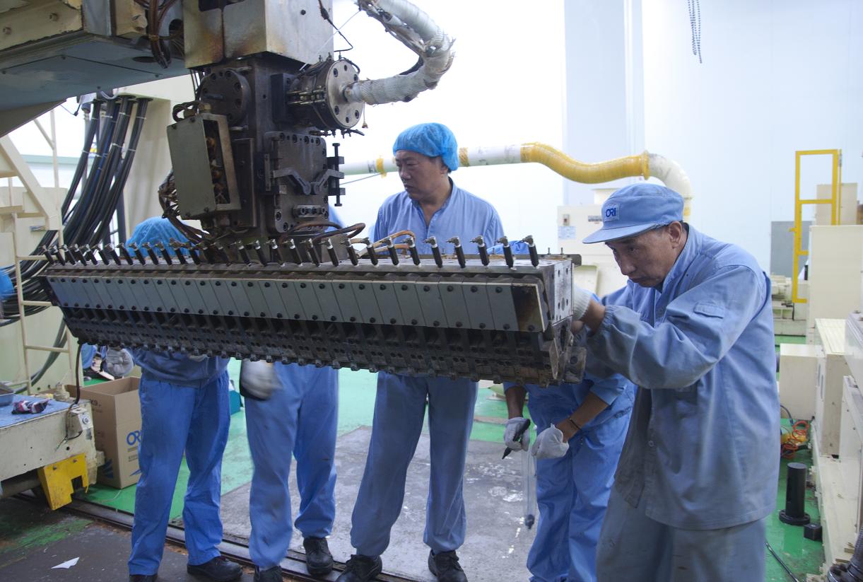 為進一步改善與提升擠出工序產品品質,減少擠出產品分切后的“起筋”現象。7月18日,設備部及二工廠相關人員對工廠內的雙頭共擠復合機第二模頭內腔部分進行了拆解與清洗,整個流程嚴格按照《擠出機模頭拆卸及清洗流程》來操作,清洗之后重新調整并測量模口的模唇間隙,以確保擠出產品整幅的厚度無偏差。